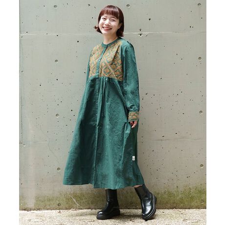 クロスステッチの図案で胸元と袖口 後ろ中心などにふんだんに刺繍を入れた前開きのワンピースです。