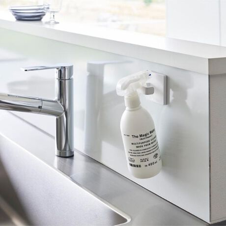 フィルムフックで簡単取り付け!お好みの場所に設置できるので、スプレー類やハンガーなど使いたい時にサッと手に取れて便利です。キッチンやシンク中にスプレーボトルを浮かせて収納できるので衛生的です。トイレ横に設置して消臭剤をひっかけておくこともできます。ランドリールームやベランダなどに縦向きに設置すれば、ハンガー収納として使用でき、洗濯物を干すときにに便利です。設置は、貼り付けたフィルムフックに本体を取り付けるだけ。