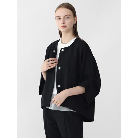 七分袖に二段階の切り替えアクセントデザインが施され構築的な美しいシルエットが人気高い、Agaロングセラーのジャケット。手首がすっきりと見える袖丈、ヒップラインが隠れる後ろ下がりのヘムラインなどスタイリングのバランスが取りやすい仕上げが魅力。セットアップでの着用はもちろん、ノースリーブワンピースなどの羽織りとしても活躍する一着です。