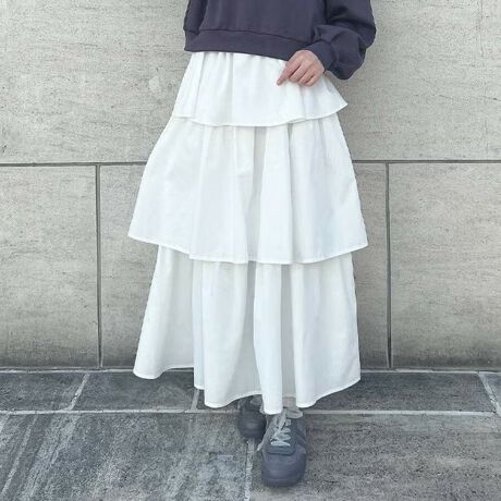 ボリューム感のあるギャザーフリルのティアードロングスカート。