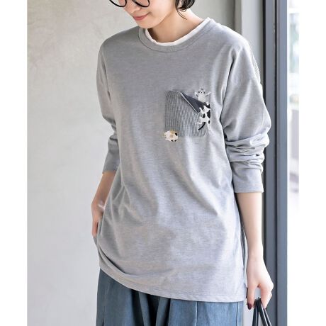 ポケットで遊んでる猫ちゃんの刺繍がポイントのカットソー。