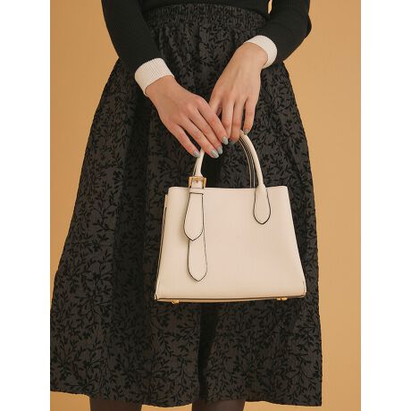 ワンサイドにのみベルトをあしらったハンドルデザインが印象的なハンドバッグ。台形シルエットの上品な佇まいが、洗練された大人の雰囲気を醸し出します。