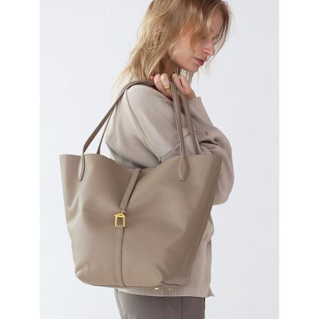 上質なレザーで仕立てた、シーンレスでマルチに使いやすいトートバッグ。間口が広く荷物の出し入れがしやすいのがデイリーに嬉しいポイント。内側のベルトを留めることでシルエットに変化をつけることができる便利な2way仕様です。