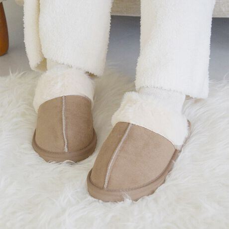 フェイクファーの肌触りが優しく、つま先まで隠れるスリッパタイプで室内も快適に過ごせるアイテム。