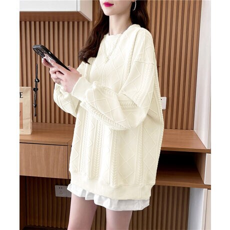 マルチケーブル編み模様はシンプルさに遊び心をプラス、肩を落としたデザインは女性らしい華奢感をアピール