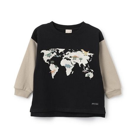 世界地図の上にたたずむ恐竜のアップリケがユニークな長袖Tシャツです。