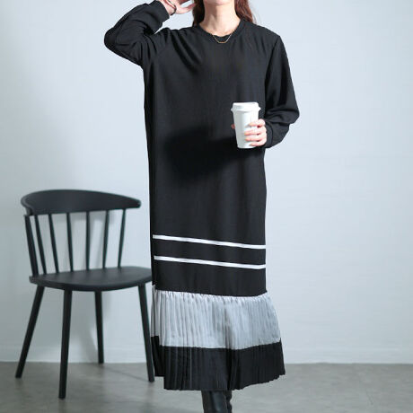 裾がプリーツに切り替わったロングワンピースです。Iラインにストンと落ちるシルエットで細見せ効果は特大!ゆったり着れるサイズ感なので、身体のラインも拾いません。裾はライン&プリーツに切替えになっており、デザイン性も高い一枚。ふわっと揺れ動くプリーツが女性らしさを高めてくれる一枚です。