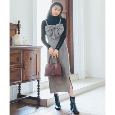 すっきりとしたIラインシルエットが細見え効果を演出してくれるリボンワンピース【Design】・存在感のあるドレープリボンが目を惹くキャミワンピース。・Iラインシルエットの女性らしい曲線的な仕上がりがポイント♪・裾にはスリットを加えることで、甘すぎずレディ感のある仕上がりとなっています。・合わせるインナーをシーズンアイテムに変えていただくことで、ロングシーズンお楽しみいただけます。・Tシャツ、シアートップス、ニットなど、様々なトップスアイテムとの相性抜群!・上品な仕上がりのアイテムなのでパーティシーンにもおすすめ◎・ショルダーはボタン留め仕様になっており、3段階の長さ調整が可能です。・背中部分はシャーリング&ファスナー仕様。【Fabic】・上品な質感のある生地を使用。・程よいハリ感のある裏地付き。・ピンク、ブラック、ブラックチェックの3色展開となります。【Care】ドライクリーニング