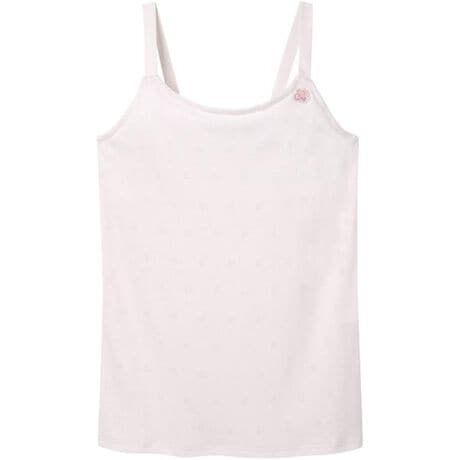 【ジュニア用ブラキャミソール STEP2】 ノンワイヤー ・スクエアネック ・キャミソール ・ストラップタイプ(調節なし)★小学生高学年におすすめのファーストブラの機能をもつブラトップ【バストがふくらみはじめた人へ、ブラジャーへのワンステップ】《やさしいつけごこちのジュニアファーストグループ》●やわらかな肌ざわり 身生地にポリエステルを綿でおおったカバードヤーンを使用し、綿のやわらかな肌ざわりにこだわった仕様●さらっと快適 芯糸はポリエステルなので、綿100%に比べてすぐれた吸汗速乾性があり、汗をかいても乾きやすい素材を身生地に使用(綿混パターンメッシュフライス素材) ●ふんわり、なめらかフィット カップの肌側は接ぎがなく、ふんわりここちよい肌ざわりで、敏感な成長期のバストにぴったり●からだの成長に合わせた工夫 からだの成長をサポートするカップ構造で、バストをやさしく包む 下辺部分は伸びのあるテープを使用し、気になるしめつけ感を軽減したソフトなつけごこち よく伸びるやわらかなストラップで、からだの成長の変化に対応●気軽に着られるブラキャミスタイル ブラジャーの形にまだ苦手意識がある方にもおすすめのブラトップタイプ・左胸にさくらんぼの刺繍モチーフ付き●詳細情報ワイヤーなしパッド受けなし※お洗濯は、必ず「取扱い表示」にしたがってください。