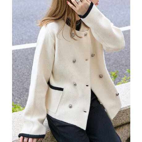 フロントのダブルボタンがエレガントさを際立たせクラシカルな印象ながらカジュアルにも着られるニットジャケット。
