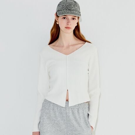 フロントに入ったスリットが、さりげない抜け感をプラスするニット。