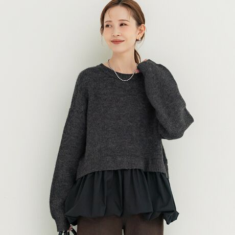 暖かみのあるニットに布帛のバルーンをドッキングした、1枚でレイヤードスタイルが完成する主役級トップス。