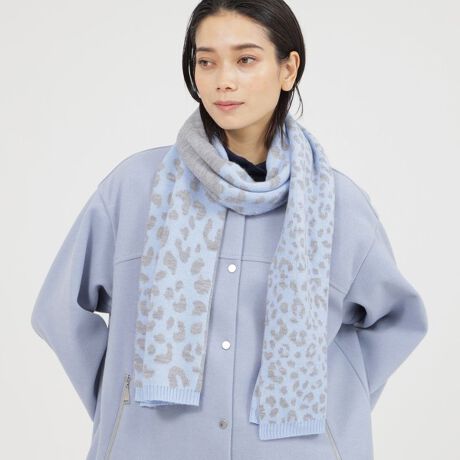 大小のレオパードと無地をブロッキングして組み合わせているデザインのニットマフラーです。丁寧に細かく編まれたニット素材なので肌当たりが良くウール混なので暖かな首元になります