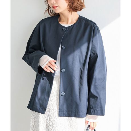 デニムなどカジュアルなボトムとも相性が良く、オンオフ問わず重宝する着回し力抜群のノーカラージャケットです。