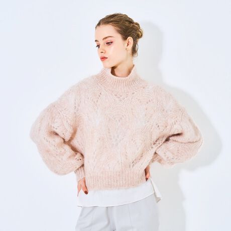 透かし編みと起毛加工で、重くなりがちなローゲージを軽やかに仕上げたニット。