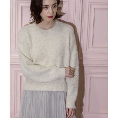 ・毛足のあるフェザーヤーンにスパンコール糸をミックスさせたきらめき感あるニット。
