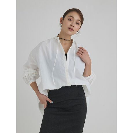 フロントのリボンがアクセントになったブラウス。ふんわりとした袖と、バックヨークに施したギャザーが女性らしい雰囲気を演出します。カジュアルなパンツにもフェミニンなスカートにも合わせやすく、幅広いスタイリングに活躍するアイテムです。