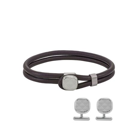 Emporio Armaniのセット。イーグルパターンをあしらったステンレススチール製カフリンクスとフックタイプのブラウンのレザーブレスレットを組み合わせました。