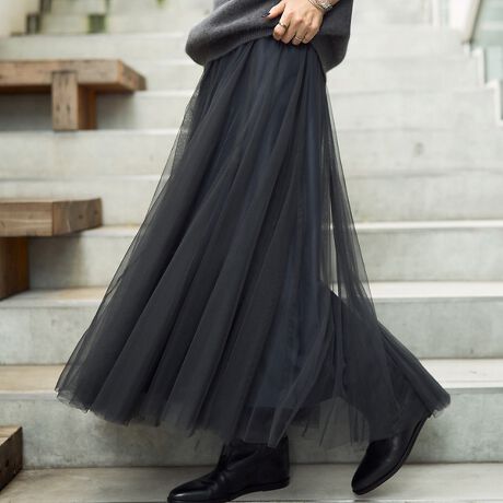 柔らかく軽やかなチュール素材をふんだんに使ったフレアスカート。