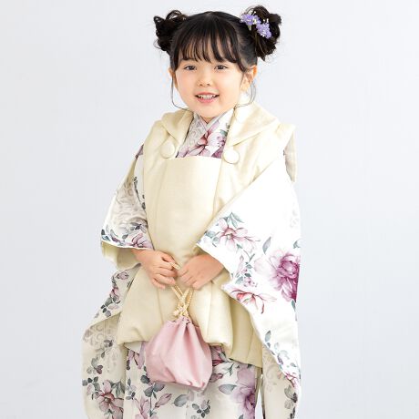 きもの館SOUBIENのプライベートブランド『floro by SOUBIEN』(フローロ)の女の子の七五三やお宮参りにおすすめな女児用の被布着物セットです。
