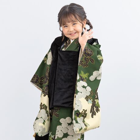 きもの館SOUBIENのプライベートブランド『floro by SOUBIEN』(フローロ)の女の子の七五三やお宮参りにおすすめな女児用の被布着物セットです。