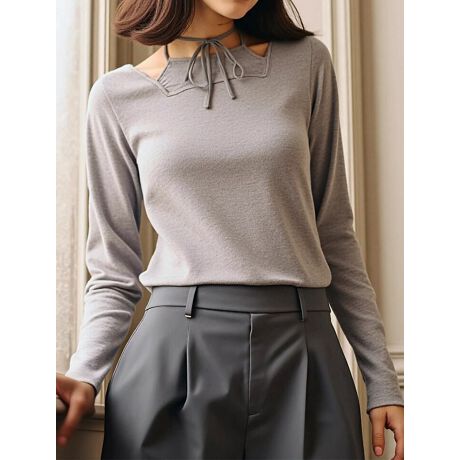チョーカー風デザインが目を惹くリブトップス