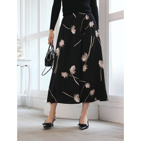 シックなモノトーンのフラワープリントが目を惹くスカート。裾に向かってふんわりと広がるシルエットが、女性らしい雰囲気を演出してくれます。ウエストはゴム仕様になっているので着脱しやすく、ストレスフリーな穿き心地も嬉しいポイントです。