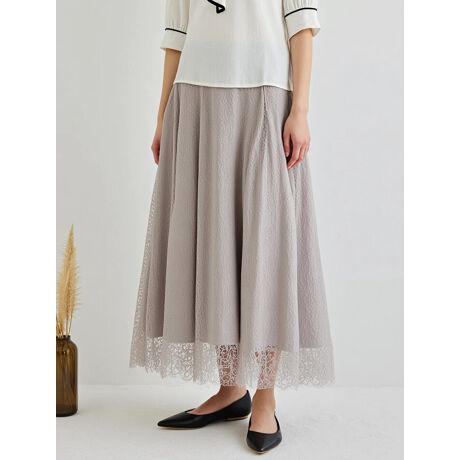 繊細なレースがエレガントで上品な印象のスカート。ほどよい透け感と、裾に向かって広がるフレアシルエットが女性らしさを演出します。合わせるトップスやシューズ次第で、デイリーからオケージョンシーンまで幅広く活躍するアイテムです。
