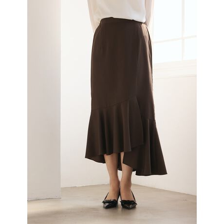 アシンメトリーなイレヘムデザインが目を惹くスカート。すっきりとした腰回りから裾にかけて広がるマーメイドシルエットが、女性らしさを演出します。合わせるトップス次第で、カジュアルにもきれいめにも幅広いスタイリングに活躍するアイテムです。
