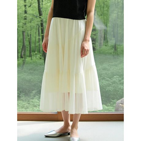 程よいシアー感と、ふんわり広がるティアードデザインがフェミニンな雰囲気を演出するスカート。ウエストはゴム仕様で、ストレスフリーな穿き心地も嬉しいポイントです。Tシャツやスニーカーなど、カジュアルなアイテムと合わせたスタイリングもおすすめです。