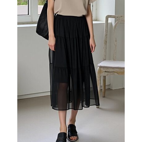 程よいシアー感と、ふんわり広がるティアードデザインがフェミニンな雰囲気を演出するスカート。ウエストはゴム仕様で、ストレスフリーな穿き心地も嬉しいポイントです。Tシャツやスニーカーなど、カジュアルなアイテムと合わせたスタイリングもおすすめです。