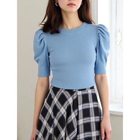 立体感のあるパフスリーブが目を惹くリブプルオーバー
