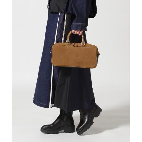 立体的なシルエットとありそうでなかった横長のカタチ。バッグ本体には厚みのある牛スエードを使用。底は牛革で切り替えを作り異素材感を強調、そしてハンドルにはバンブー素材。多様な素材が巧みにドッキングされ、シンプルながらも徹底的に計算された存在感のあるデザインに仕上げられています。素材について(牛床革)本商品は牛床革を使用しております。注意点・素材の特性上、水分や汗、摩擦などにより色落ちすることがございます。特に雨の日の使用と、白物・淡色物との着用は避けていただきますようお願いいたします。・長時間の直射日光に当たると変色する可能性がございます。保管場所などにはご注意ください。・水に弱い素材となっておりますので、濡れた場合はなるべく早く水気を拭き取り風通しのよい場所で陰干ししてください。(ドライヤーなどの熱風を当てることはお控え下さい。)・革表面に傷やシワなどがつきやすい素材となっております。また、表面が柔らかく素材の性質上、表面にこすれやシワなどがついている場合もございますが、こちらは商品自体の不良ではございませんので予めご了承くださいませ。・汚れた場合には、乾いた布で軽くこする等のお手入れをお願いいたします。・スエード素材の為、液体のレザークリーム等の使用はお控えいただきますようお願いいたします。・定期的に色落ち防水スプレーなどでケアしていただくことを推奨しております。<ajew>2009年にバッグブランドとして設立された、<ajew(エジュー)>ジャンルや概念にとらわれない“記憶に残るもの”づくりを手がけ、独創性と機能性を兼ねそろえたアイテムを展開し、毎シーズンヒット商品を生み出しています。近年オリジナルIphoneケースの爆発的なヒットにより、従来の購買層である女性ファンに加え男性からの高い支持も獲得。ファッション雑貨において一線を画す、注目のドメスティックブランドです。