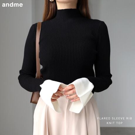 無地 ボーダー 配色 フレアスリーブ リブ ニット トップス