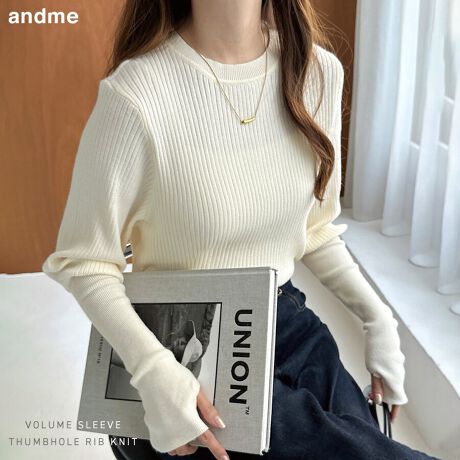 ボリューム袖 サムホール リブ ニット トップス