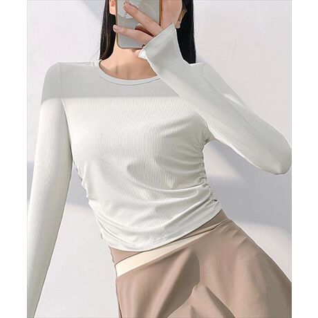 シンプルで着まわしやすいサイドギャザーリブトップス。
