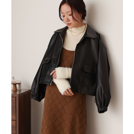 Babから待望の合皮ジャケットが登場!どんなテイストにも合わせやすく、汎用性高くお召し頂きやすいシンプルなデザインでお作りしました。可愛らしいギャザーシルエットを楽しめるゴム仕様の袖口や、裾のさりげないドローコードでBabらしいひと癖ディティールも目を惹くアクセントに。見た目よりとても軽量で、気兼ねなくお召し頂きやすい1枚です。