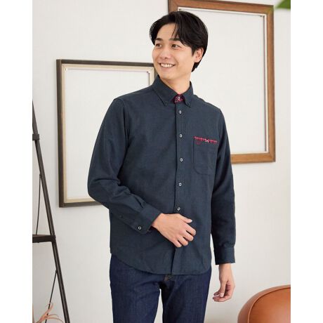 部分的に別生地で切り替えたボタンダウン襟シャツです。柔らかな表情の撚り杢生地を使用しています。切替部分のチェックがコーディネートのアクセントになるシャツです。