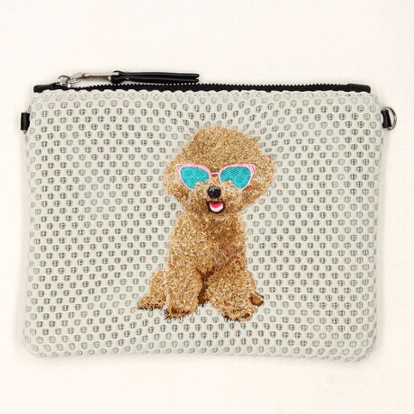 [型番:FB29800]【オリジナルデザイン】ポリエステル素材のアニマル柄刺繍ポーチ。Dカンがついているのでお好きなショルダーをつけてサコッシュとしてもご使用いただけます。