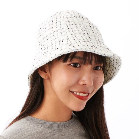 [型番:R16-804Q]キラキラしたラメ糸が織り込まれたツイード素材を使用したチューリップハットです。存在感がありながらもシンプルなデザインなので、カジュアルにもエレガントにも着こなせます。UVカット機能が搭載されており、日差しの強い日でも安心してご使用いただけます。さらに、サイズ調整が可能なアジャスター付きで、快適なフィット感を実現。