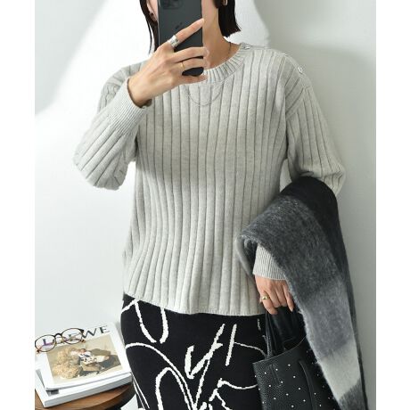 もちもちで柔らかな肌触りが特徴のニットプルオーバー。程よい厚みでしっかりとしたリブの編地で仕上げました。ショルダーの釦がアクセントになり、控えめな開きのクルーネックでシンプルながら上品に着まわせるので大人な印象にも◎