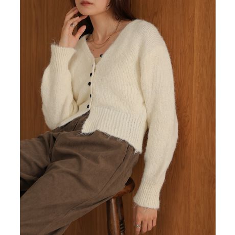 ブラックのクルミボタンが印象的なショートカーディガン!フェミニンなシャギー感で女性らしい雰囲気を作り出してくれます。スタイルアップが叶うショート丈と首元をすっきりシャープに魅せるVネックは可愛らしい雰囲気の中に抜け感を演出。広めにとった裾リブはウエストの華奢見えも叶えてくれます。暖かみのある見た目でシーズンムードを加速させる1枚です。