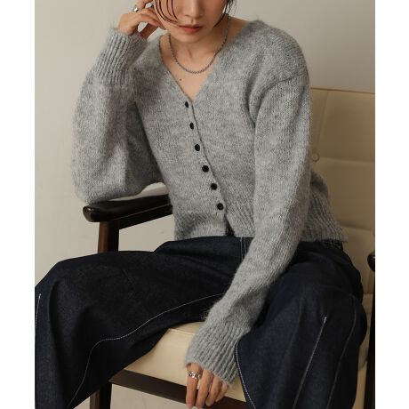 ブラックのクルミボタンが印象的なショートカーディガン!フェミニンなシャギー感で女性らしい雰囲気を作り出してくれます。スタイルアップが叶うショート丈と首元をすっきりシャープに魅せるVネックは可愛らしい雰囲気の中に抜け感を演出。広めにとった裾リブはウエストの華奢見えも叶えてくれます。暖かみのある見た目でシーズンムードを加速させる1枚です。