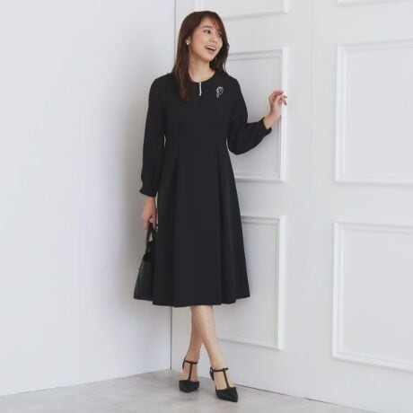 フロントのキーネックにパーツ調パーツをあしらった、華やかで上品なデザインワンピース