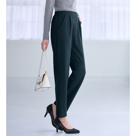 ・フロントのタックで腰回りにゆとりを持たせつつ、裾に向かって細くなるデザインで美脚効果も◎