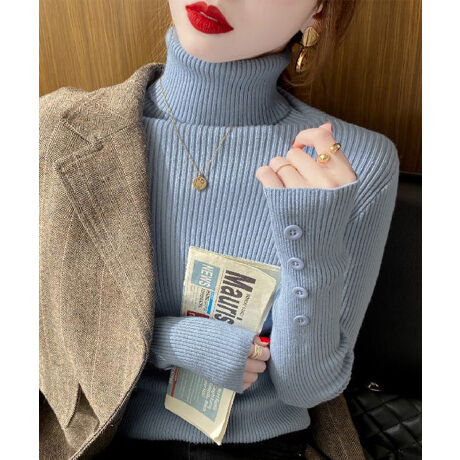袖ボタンがカワイイ、ハイネックリブニットトップスが新登場!