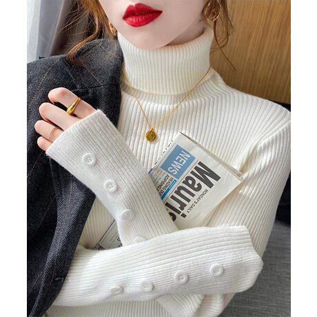 袖ボタンがカワイイ、ハイネックリブニットトップスが新登場!