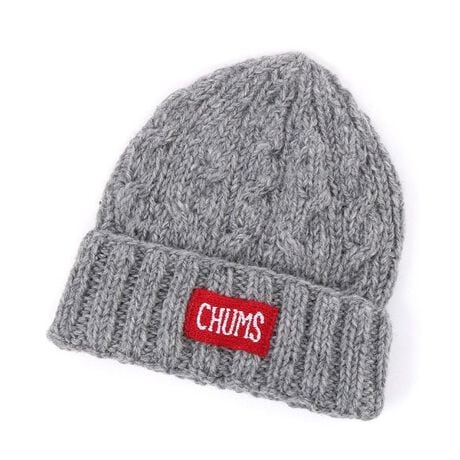 フロントに編み込んだCHUMSロゴがワンポイント、温もりある表情のケーブル編みのニット帽〈素材特性〉