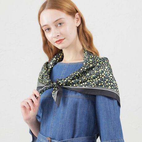シルクならではの上品な発色でSnowblue Garden柄が映える大判スカーフ。
