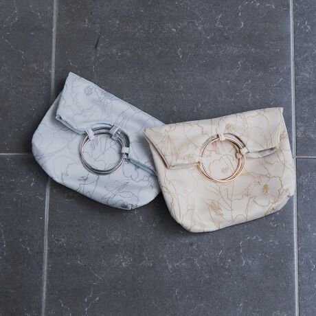 持ち手部分が真鍮のリングデザインとなっており、アクセサリー感覚でドレスアップできるアイテムです。